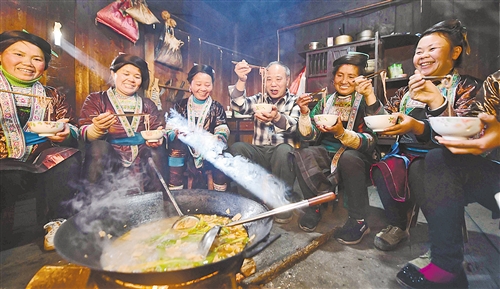 在廣西融水苗族自治縣桿洞鄉(xiāng)黨鳩村烏英苗寨,農(nóng)業(yè)專家蘭生葵(右三)和村民品嘗紅高粱螺螄粉。