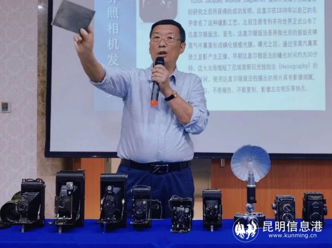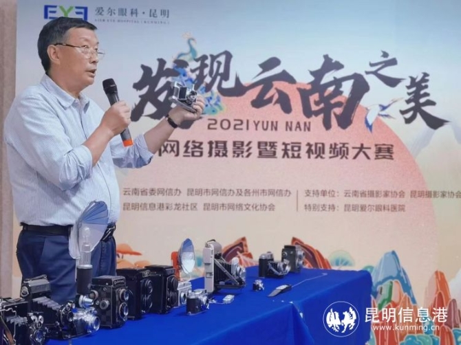 4月24日,2021“發(fā)現(xiàn)云南之美”網(wǎng)絡(luò)攝影暨短視頻大賽首期線下沙龍?jiān)诶ッ鲪?ài)爾眼科醫(yī)院三樓舉行。彩龍社區(qū)特別邀請(qǐng)了相機(jī)收藏大家朱寶昆先生做現(xiàn)場(chǎng)分享。朱寶昆是中國(guó)民俗攝影協(xié)會(huì)副會(huì)長(zhǎng),昆明攝影家協(xié)會(huì)副主席,云南省收藏家協(xié)會(huì)常務(wù)理事,云南省攝影家協(xié)會(huì)會(huì)員,昆明收藏家協(xié)會(huì)會(huì)員?,F(xiàn)收藏有600多臺(tái)中外老相機(jī)和近千幅老照片(玻璃底片)和攝影文獻(xiàn)(畫(huà)冊(cè)),所以人們也稱他為相機(jī)收藏大家。本次沙龍,朱老師帶了20余種老相機(jī),帶領(lǐng)現(xiàn)場(chǎng)朋友們從老相機(jī)里回顧相機(jī)的誕生和發(fā)展歷程。