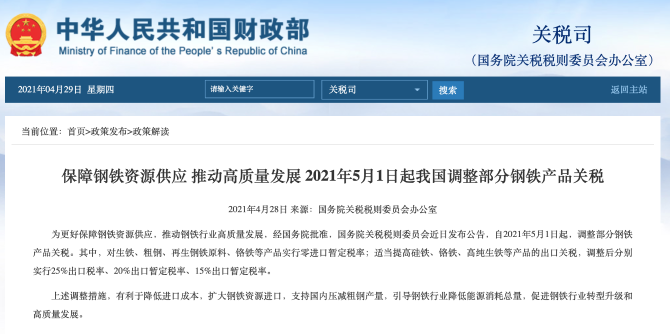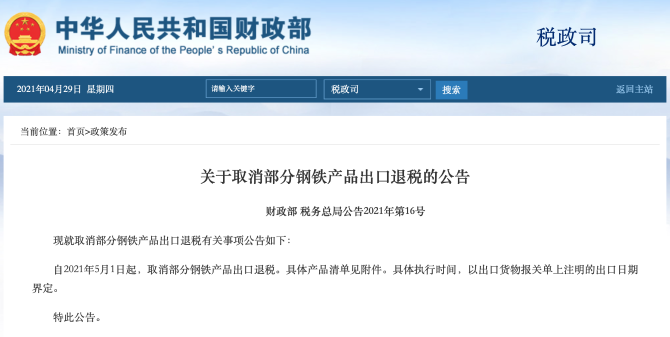 此外,財政部、國家稅務(wù)總局28日聯(lián)合發(fā)布公告稱,自2021年5月1日起,取消部分鋼鐵產(chǎn)品出口退稅。具體產(chǎn)品清單見附件。具體執(zhí)行時間,以出口貨物報關(guān)單上注明的出口日期界定。