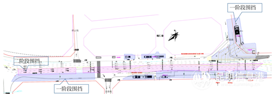 為方便沿線群眾出行,充分利用地下空間緩解城市交通擁堵,地鐵項(xiàng)目一般沿城市主干道路敷設(shè),車站、出入口一般設(shè)置在人流量較為集中的主干道或交叉路口,為確保在施工安全和道路通行,建設(shè)期間必須占用部分道路圍擋施工。地鐵車站需分多期圍擋開展建設(shè),正常情況下,一般標(biāo)準(zhǔn)車站需分六期圍擋,特殊情況將多達(dá)八期以上,如西昌路站圍擋將分十二期開展。標(biāo)準(zhǔn)車站一期圍擋開展施工范圍內(nèi)地上、地下管線遷改,二、三期圍擋根據(jù)道路現(xiàn)狀分半幅開展道路蓋板施工、主體結(jié)構(gòu)施工,四、五期圍擋分別開展道路兩側(cè)附屬結(jié)構(gòu)施工,六期圍擋實(shí)施管線回遷和道路恢復(fù)。