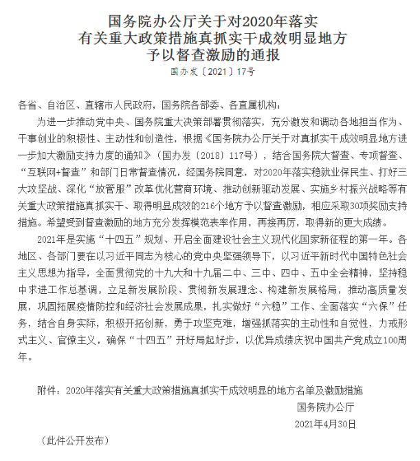 國務(wù)院辦公廳近日印發(fā)通報(bào),對2020年落實(shí)穩(wěn)就業(yè)保民生、打好三大攻堅(jiān)戰(zhàn)、深化“放管服”改革優(yōu)化營商環(huán)境、推動創(chuàng)新驅(qū)動發(fā)展、實(shí)施鄉(xiāng)村振興戰(zhàn)略等有關(guān)重大政策措施真抓實(shí)干、取得明顯成效的216個地方予以督查激勵,相應(yīng)采取30項(xiàng)獎勵支持措施。