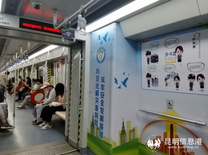 在本次新上線的“防災(zāi)減災(zāi)”“安全生產(chǎn)”地鐵宣傳專列上,整列車6節(jié)車廂分為防災(zāi)減災(zāi)、安全生產(chǎn)和自然災(zāi)害綜合風險普查三大主題系列,在車廂內(nèi),車窗、車門以及車廂內(nèi)背景等位置,都設(shè)置了通俗易懂的宣傳內(nèi)容,既有既有圖文并茂的應(yīng)急安全知識,也有輕松活潑的卡通漫畫。車載顯示屏上,還滾動播放著昆明應(yīng)急動畫宣傳片。乘客走進車廂,就能輕松學(xué)習到豐富實用的防災(zāi)減災(zāi)及安全知識。