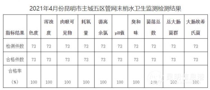 昆明信息港訊 記者黃彩英 記者從昆明市衛(wèi)生健康委員會獲悉,2021年4月由昆明市五華、盤龍、西山、官渡、呈貢五區(qū)疾病預防控制中心對市政供水的75個管網(wǎng)末梢點末梢水水質(zhì)進行了衛(wèi)生監(jiān)測檢測,綜合合格率為100%。