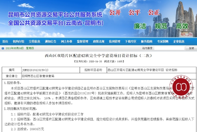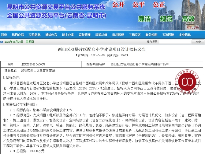 記者日前從昆明市投資促進(jìn)局獲悉,西山區(qū)教育體育局4月25日發(fā)布西山區(qū)雙塔片區(qū)配套小學(xué)建設(shè)項(xiàng)目設(shè)計(jì)招標(biāo)公告,擬總投資1.3億元于該片區(qū)配建小學(xué)。計(jì)劃開始時(shí)間為2021年6月1日。