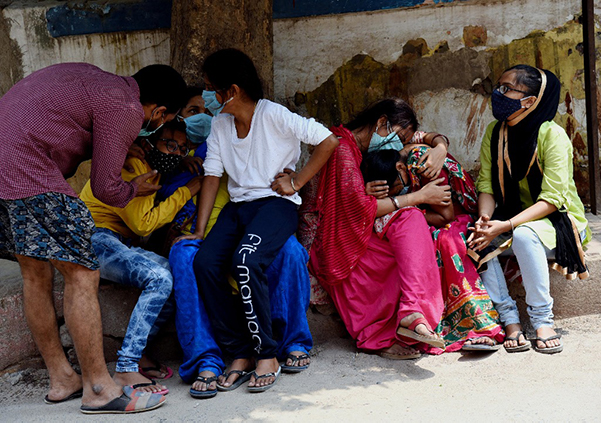 5月5日,在印度巴特那的一所醫(yī)院外,因新冠失去親人的人們神色悲傷。(新華社發(fā))
