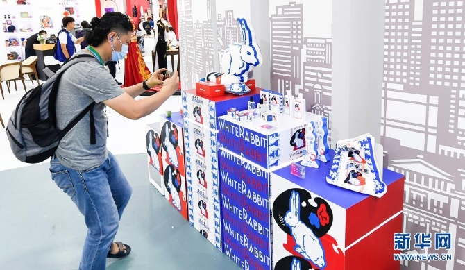 參觀者在首屆消博會上拍攝展出的大白兔奶糖周邊產(chǎn)品(5月7日攝)。新華社記者 楊冠宇 攝