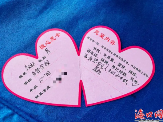 希望擁有一塊手表,能跟著指針按時(shí)回家;希望收到超級(jí)飛俠拼圖禮物,與朋友共享歡樂(lè)時(shí)光;希望擁有藍(lán)牙耳機(jī),學(xué)習(xí)英語(yǔ)聽力……2021年第五屆??凇耙詯?ài)之名圓夢(mèng)微心愿”網(wǎng)絡(luò)公益活動(dòng)啟動(dòng),5月8日,活動(dòng)主辦方走進(jìn)??谑邢蠕h學(xué)校,收集了首批60個(gè)孩子的微心愿。