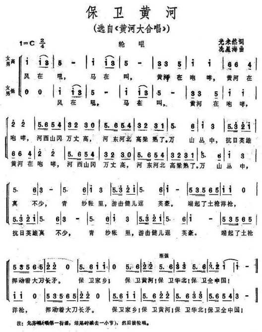 《保衛(wèi)黃河》由光未然作詞、冼星海作曲,是《黃河大合唱》的第七樂章。歌曲采用齊唱、輪唱的演唱形式,具有廣泛的群眾性,是抗日軍民廣為傳唱的一首歌曲。