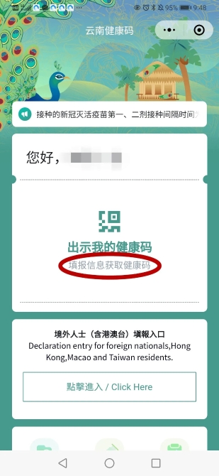 點(diǎn)擊“云南健康碼”,進(jìn)入首頁,點(diǎn)擊“填報(bào)信息獲取健康碼”