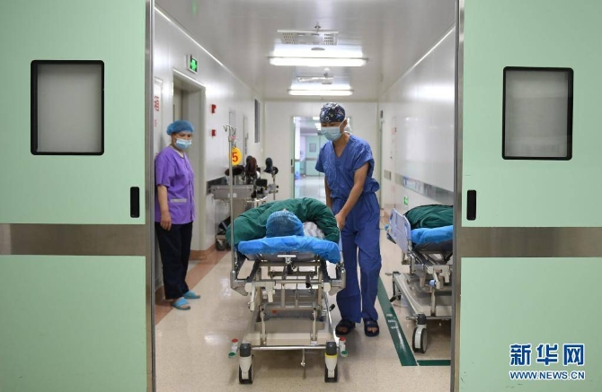 5月10日,福建中醫(yī)藥大學(xué)附屬第二人民醫(yī)院主管護師張志恩(右)推著患者進入手術(shù)室。新華社記者 林善傳/攝