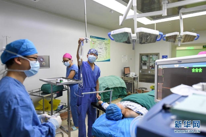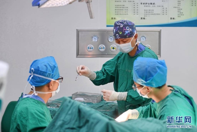 5月10日,福建中醫(yī)藥大學(xué)附屬第二人民醫(yī)院主管護師張志恩(中)在手術(shù)中給醫(yī)生傳遞器械。新華社記者 林善傳/攝