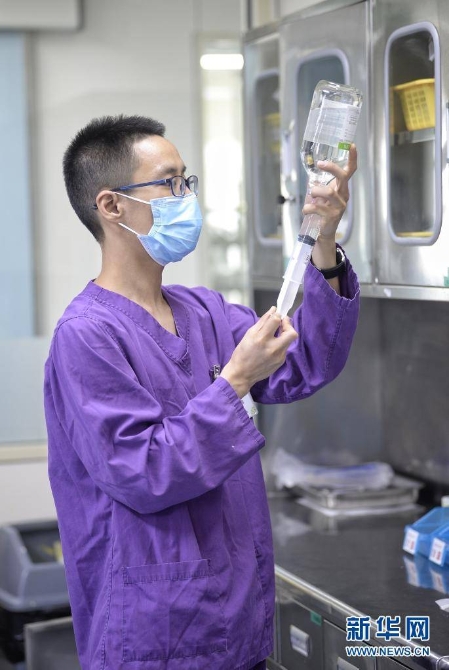 5月10日,劉鑫在四川省腫瘤醫(yī)院ICU病房內(nèi)準備配藥。新華社記者 劉坤/攝