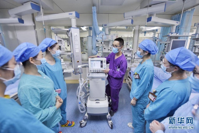 5月10日,劉鑫(中)在四川省腫瘤醫(yī)院ICU病房內(nèi)對新入職護士進行臨床教學(xué)。新華社記者/劉坤 攝