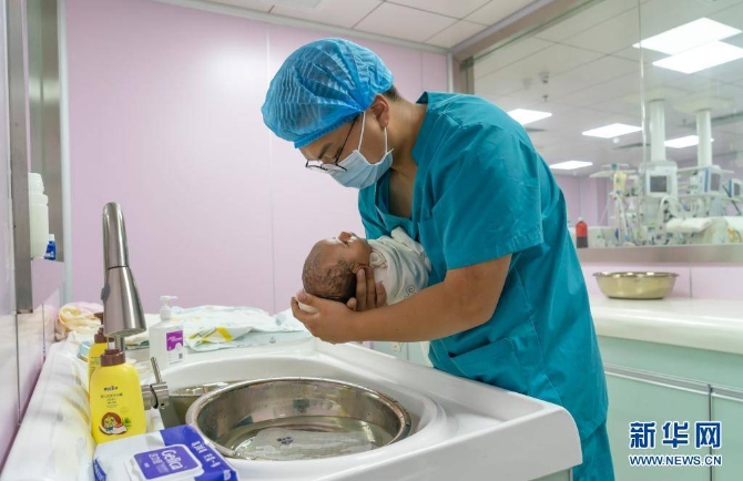 5月10日,李卓祥為一名新生患兒洗頭。新華社記者陳欣波/攝
