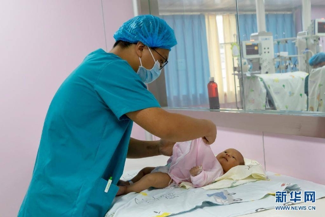 5月10日,李卓祥為洗完澡的新生患兒穿衣服。新華社記者陳欣波/攝