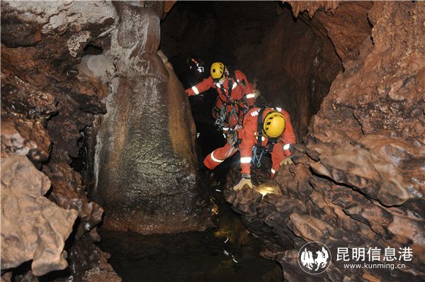 23時30分,到達(dá)現(xiàn)場后,山岳大隊救援人員經(jīng)過詢問報警人、現(xiàn)場探勘后,調(diào)派8名骨干隊員組成搜救組,攜帶洞穴救援裝備器材入洞搜救。由于燕子洞內(nèi)陰暗無光、地勢陡峭復(fù)雜、路線岔口繁雜,加之洞內(nèi)常年有地下河流淌,巖壁濕滑,導(dǎo)致救援難度直線增高。前突搜救人員利用繩降、攀巖等方式,努力翻越途中的各種地勢阻礙,堅持不懈地向洞底挺進(jìn)搜尋。5月10日凌晨5時20分許,救援人員搜尋至洞底,未發(fā)現(xiàn)被困人員。由于搜尋時間長、體力消耗大、器材裝備需要補(bǔ)充更換,救援人員只能先行撤出修整。在救援期間,為解決洞內(nèi)無線通訊不暢的問題,自行前往增援的云南省登山協(xié)會、藍(lán)天救援隊人員攜帶無線通訊設(shè)備深入洞內(nèi),為前方搜救組搭建串聯(lián)通訊通道。