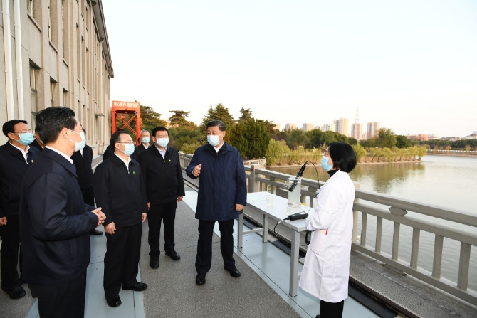 ↑2020年11月13日,習(xí)近平在江蘇省揚州市考察調(diào)研。這是習(xí)近平在江都水利樞紐,了解南水北調(diào)東線工程規(guī)劃建設(shè)和樞紐運行等情況。
