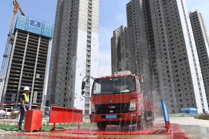↑在甘肅省蘭州市中建三局一處建設(shè)工地上,感應(yīng)式的洗車臺利用循環(huán)再生水沖洗車輛,并對污水再次回收利用(5月12日攝)。