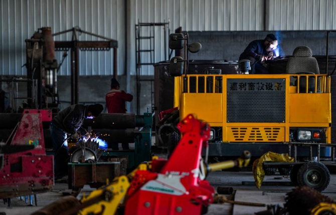 ↑2020年3月10日,工人在內(nèi)蒙古嘉利節(jié)水灌溉有限公司廠房內(nèi)加工零件。