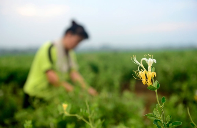 ↑農(nóng)民在河南省淅川縣九重鎮(zhèn)中藥材種植基地采摘金銀花(2016年7月30日攝)。位于南水北調(diào)中線一期工程水源地的淅川縣,通過發(fā)展金銀花、軟籽石榴、有機(jī)蔬菜等綠色生態(tài)產(chǎn)業(yè),實現(xiàn)了生態(tài)保護(hù)和百姓增收的平衡發(fā)展。