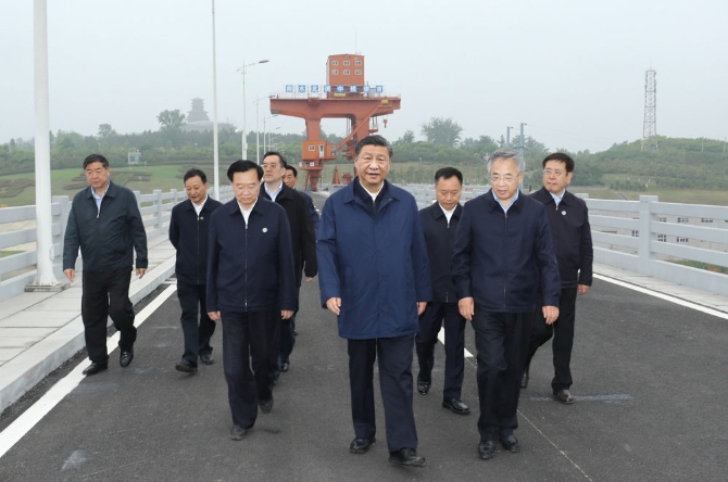 ↑5月13日下午,習(xí)近平在南陽市淅川縣陶岔渠首樞紐工程考察。