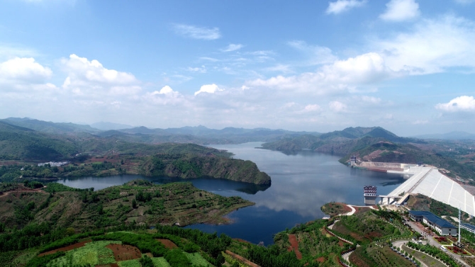 ↑位于河南省汝陽縣前坪村的前坪水庫,是一座以防洪為主,兼具供水、灌溉、發(fā)電功能的大型水利樞紐工程,是國務(wù)院確立的172項節(jié)水供水重大水利工程之一(無人機(jī)照片,4月26日攝)。