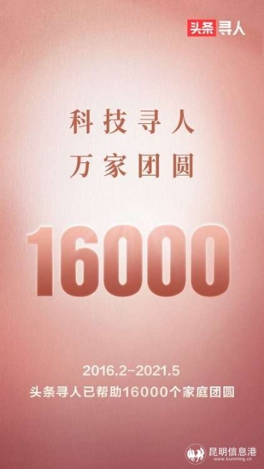 昆明信息港訊 記者勞學(xué)麗 5月17日,北京字節(jié)跳動(dòng)旗下公益項(xiàng)目“頭條尋人”宣布,該項(xiàng)目已經(jīng)累計(jì)幫助16000個(gè)家庭團(tuán)圓。其中包括11832名救助站尋親家庭,1138個(gè)烈士家庭,328個(gè)兩岸家庭,18個(gè)華人華僑家庭,377個(gè)無名患者家庭。