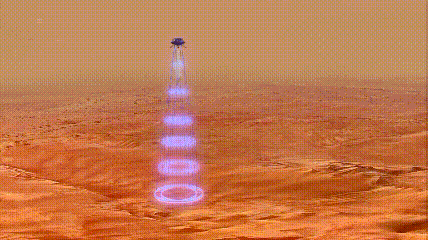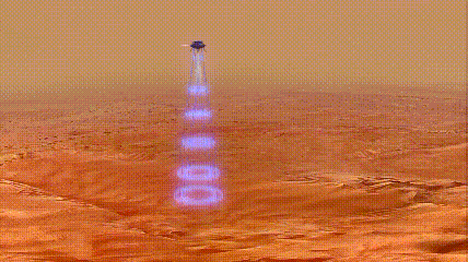 著陸器同背罩分離。同時(shí),發(fā)動(dòng)機(jī)點(diǎn)火,著陸緩沖機(jī)構(gòu)展開。大概飛行到距離火星表面1.1公里,拋掉降落傘,速度降到95米/秒。著落器反推發(fā)動(dòng)機(jī),最大反推力達(dá)到7500牛,速度降低到1.5米/秒。