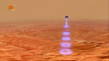 接下來,著陸巡視器需要立刻打開自己的減速傘,直到速度降至每秒不到一百米時(shí),其帶的變推力發(fā)動(dòng)機(jī)會準(zhǔn)時(shí)開機(jī),進(jìn)入動(dòng)力下降段。