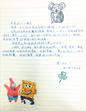 這期間,小聶收到這名小女孩父母寫來的一封感謝信。5月12日,她拿起筆給這個小妹妹寫了一封滿懷深情的鼓勵信,并畫了“海綿寶寶”“派大星”的動畫形象,鼓勵這個小妹妹早日戰(zhàn)勝病魔,健康成長。信里這樣寫道:“再忍一會兒,我們的小可愛馬上就可以出去跑了,擁抱美好的世界,迎接屬于自己的未來!我很幸運可以有機會給別人第二次生命!”