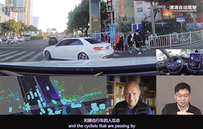 滴滴自動(dòng)駕駛測(cè)試車(chē)和騎自行車(chē)的人互動(dòng)。受訪者供圖。