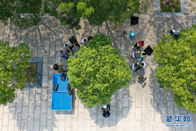 在江蘇省徐州市賈汪區(qū)潘安湖街道馬莊村,由村民組成的馬莊村銅管樂團部分成員在排練(2020年9月8日攝,無人機照片)。新華社記者 季春鵬 攝