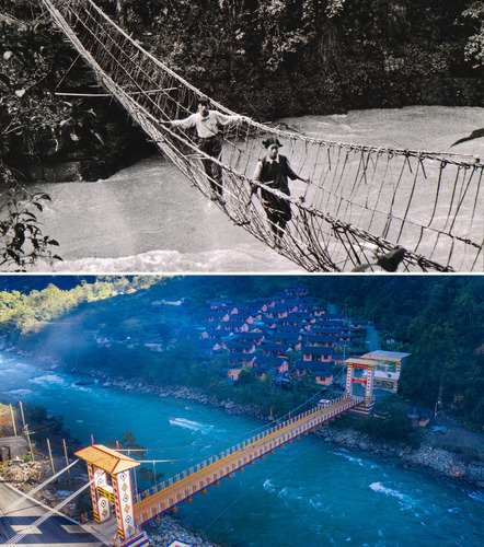 拼版照片上圖:云南獨龍族群眾通過藤篾橋(資料照片);下圖:云南獨龍江鄉(xiāng)白來感恩大橋(2020年10月29日攝,無人機照片,新華社記者胡超攝)。