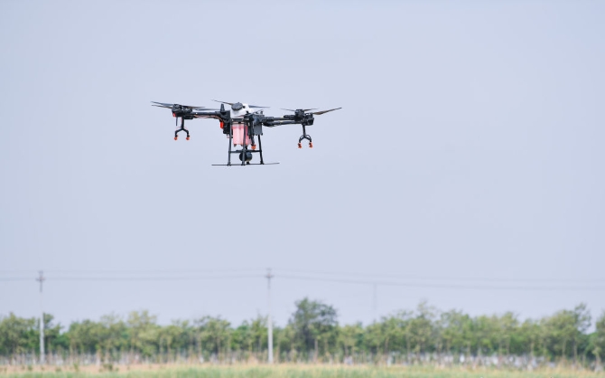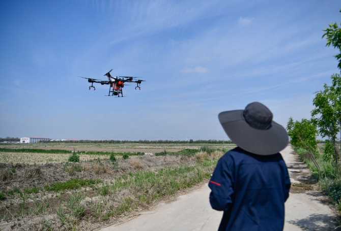 ↑在天津市西青區(qū)王穩(wěn)莊鎮(zhèn),植保無(wú)人機(jī)進(jìn)行除草劑噴灑作業(yè)(5月11日攝)。新華社發(fā)(孫凡越攝)