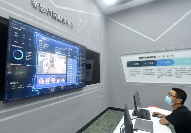↑工作人員在中新天津生態(tài)城智慧小區(qū)服務(wù)中心內(nèi)查看小區(qū)綜合服務(wù)平臺(tái)(2020年8月13日攝)。新華社記者趙子碩攝