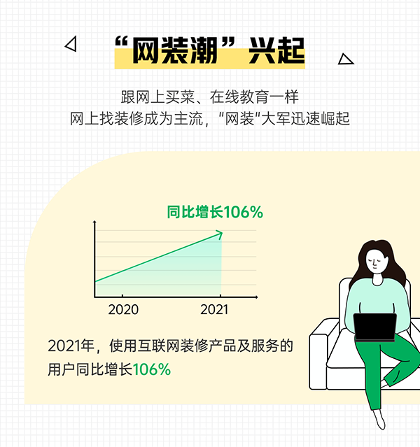 在2020年特殊環(huán)境的影響下,互聯(lián)網(wǎng)開始滲透大家生活中的方方面面,人們的消費(fèi)方式和消費(fèi)習(xí)慣發(fā)生了很大的改變,網(wǎng)上買菜、網(wǎng)上上課、社區(qū)團(tuán)購……不可否認(rèn)的是,網(wǎng)上找裝修也逐漸成為主流,“網(wǎng)裝大軍”快速崛起。數(shù)據(jù)顯示,2021年使用互聯(lián)網(wǎng)裝修產(chǎn)品及服務(wù)的用戶同比增長106%。