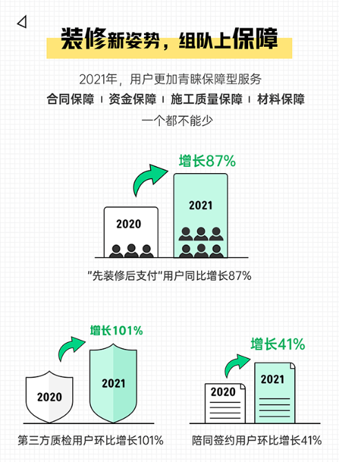 報(bào)告還挖掘分析了互聯(lián)網(wǎng)裝修用戶的深層訴求,調(diào)查發(fā)現(xiàn),先裝修后支付用戶同比增長近9成;第三方質(zhì)檢用戶環(huán)比增長一倍有余;陪同簽約用戶環(huán)比增長約41%,一系列數(shù)據(jù)足以表明,2021年用戶更加青睞保障型服務(wù),包括但不限于合同保障、資金保障、施工質(zhì)量保障、材料保障等服務(wù)。早在2020年年底,互聯(lián)網(wǎng)裝修平臺(tái)土巴兔從“用戶痛點(diǎn)”入手,針對(duì)“裝修保”全面升級(jí),推出“裝修保2.0”全新保障體系,涵蓋了先裝修后支付、第三方質(zhì)檢、陪同簽約、正品輔材等保障措施,得到了用戶的一致認(rèn)可。