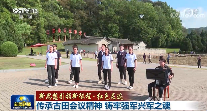 在古田會(huì)議舊址前的廣場(chǎng)上,一群來自上海的學(xué)生正在用快閃的方式傳唱革命經(jīng)典歌曲。