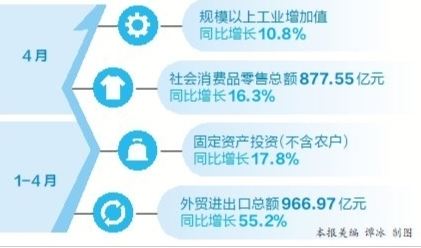 從對外貿(mào)易情況看,出口繼續(xù)保持快速增長。1月至4月,全省外貿(mào)進(jìn)出口總額966.97億元,同比增長55.2%,增速較1月至3月回落4.5個百分點(diǎn)。其中,出口539.26億元,同比增長128.8%;進(jìn)口427.71億元,同比增長10.5%。