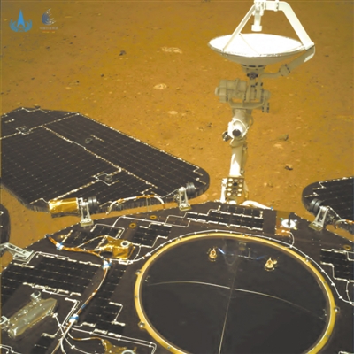 由導(dǎo)航相機(jī)拍攝,鏡頭指向火星車尾部。圖中可見火星車太陽翼、天線展開正常到位;火星表面紋理清晰,地貌信息豐富。國家航天局供圖