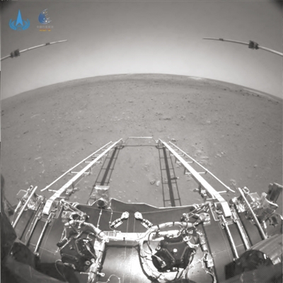 由火星車前避障相機(jī)拍攝,正對(duì)火星車前進(jìn)方向。圖中可見坡道機(jī)構(gòu)展開正常;圖像上部的兩個(gè)伸桿為已經(jīng)展開到位的次表層雷達(dá);前進(jìn)方向地形清晰。避障相機(jī)采用大廣角鏡頭,在廣角鏡頭畸變的影響下,遠(yuǎn)處地平線形成一條弧線。