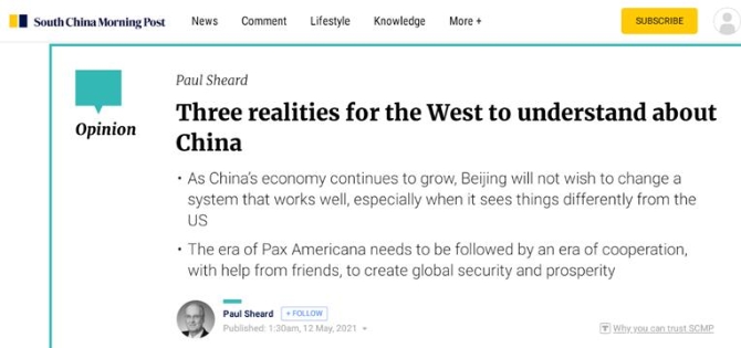 【環(huán)球網(wǎng)報(bào)道】香港《南華早報(bào)》5月12日刊發(fā)美國(guó)哈佛大學(xué)肯尼迪政府學(xué)院研究員保羅·謝爾德的文章,題為“西方應(yīng)了解中國(guó)的三個(gè)現(xiàn)實(shí)”。文章稱,世界的命運(yùn)將在很大程度上受到未來(lái)幾年和幾十年里中美關(guān)系狀況的影響。文章建議中美兩國(guó)加強(qiáng)合作,共同解決全球性問題。