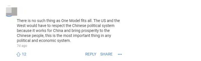 一位網(wǎng)友評(píng)論說(shuō):“沒有一種萬(wàn)能的模式。美國(guó)和西方必須尊重中國(guó)的政治制度,因?yàn)樗m合中國(guó),為中國(guó)人民帶來(lái)了繁榮,這對(duì)任何政治經(jīng)濟(jì)體制來(lái)說(shuō)都是最重要的事?!薄?/p>