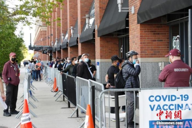 資料圖:當(dāng)?shù)貢r(shí)間5月12日,美國紐約大都會(huì)棒球隊(duì)主場(chǎng)花旗球場(chǎng)新冠疫苗接種點(diǎn),民眾排隊(duì)接種疫苗。 中新社記者 廖攀 攝