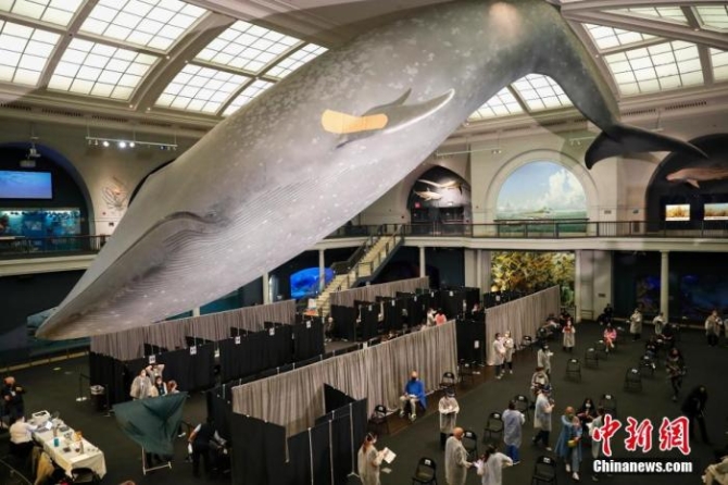 資料圖:當(dāng)?shù)貢r(shí)間4月23日,位于紐約的美國自然歷史博物館開辟米爾斯坦海洋生物大廳為新冠疫苗接種點(diǎn),為18歲以上的紐約居民接種新冠疫苗。 中新社記者 廖攀 攝