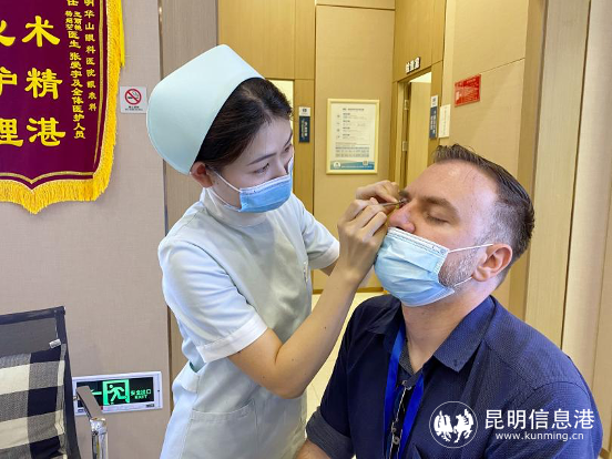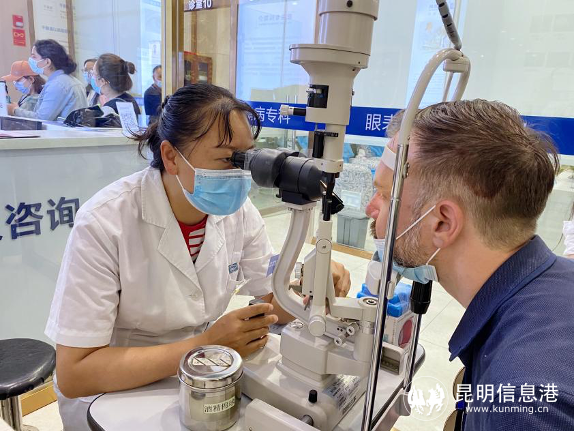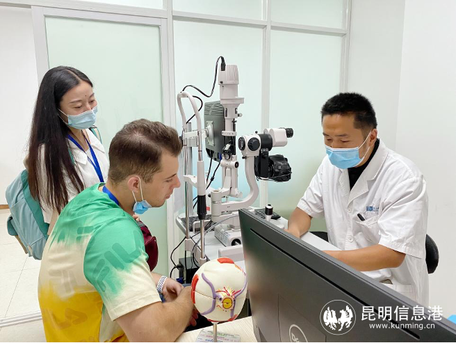 “接下來大家可以體驗(yàn)干眼的螨蟲檢查……”外教們參觀了昆明艾維眼科醫(yī)院特色干眼門診,昆明艾維眼科醫(yī)院角膜病及眼表??聘敝魅螐堄裼⑨t(yī)生為大家介紹了什么是干眼癥,干眼診療設(shè)備分別有什么用途,怎么治療干眼癥等。