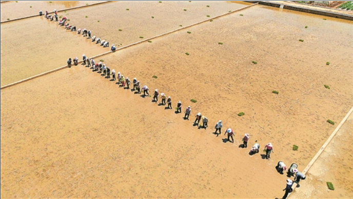 日前,蒙自市草壩鎮(zhèn)袁隆平超級雜交水稻“超優(yōu)千號”移栽完畢,2000盤秧苗移栽到101畝水田,瞄準畝產(chǎn)1200公斤的目標,向水稻畝產(chǎn)世界紀錄發(fā)起沖擊。
