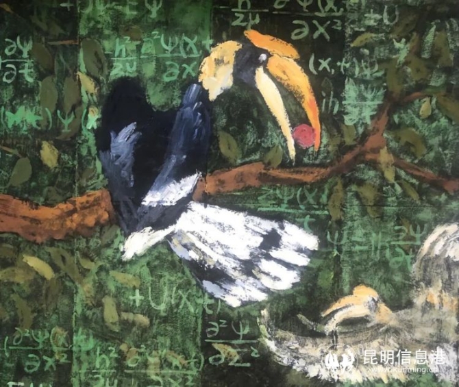 王馨曼的藝術表達從繪畫到裝置藝術,也從交互性的公共藝術到了可以連接自然人性的體驗性藝術。她表示,希望更多的人思考自然界中隱藏的部分,不僅僅是直觀的色彩和動物形象的藝術關聯,更是潛在的科學。通過畫面融入量子力學公式和有千年歷史的東巴文字,給予觀眾通過量子力學公式的符號與東巴文進行對比展開時間、宇宙、人類與自然等多維空間交錯邊界的審視。(昆明信息港)