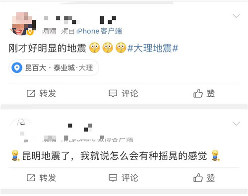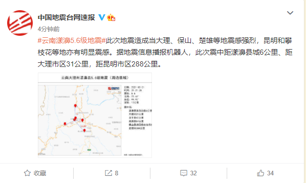 此次地震造成當(dāng)大理、保山、楚雄等地震感強(qiáng)烈,昆明和攀枝花等地亦有明顯震感。據(jù)地震信息播報機(jī)器人,此次震中距漾濞縣城6公里、距大理市區(qū)31公里,距昆明市區(qū)288公里。