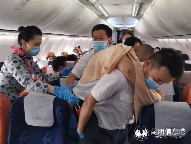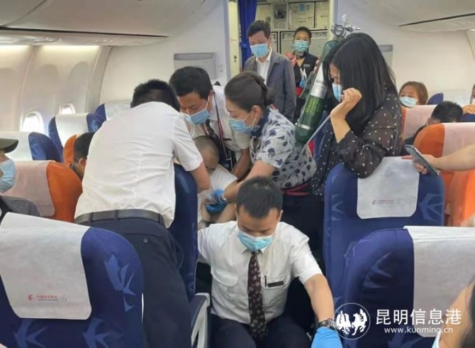 “我來!我來!” 兩位昆華醫(yī)院的醫(yī)生來到旅客身邊。經(jīng)詢問、檢查得知旅客有糖尿病史,目前血糖高、血壓低,血氧飽和度較低、嚴重缺氧,幸運的是乘務(wù)組已讓其吸氧,但旅客的身體狀況,需要立即就醫(yī)。得到初步診斷后,乘務(wù)長立即報告機長申請滑回且需要機場急救。